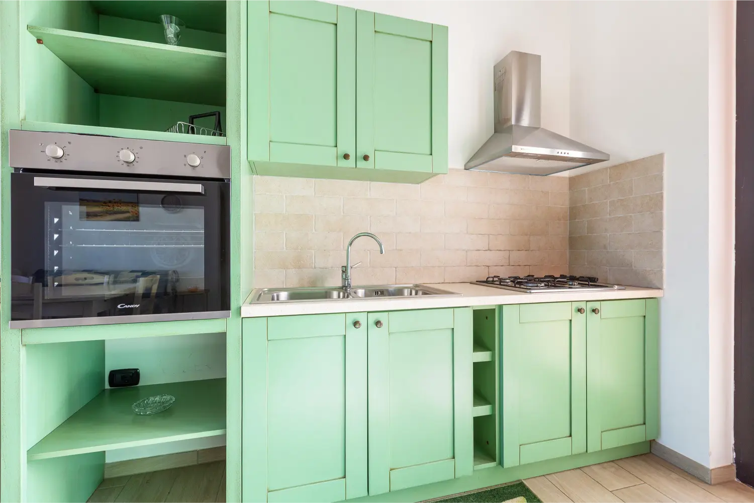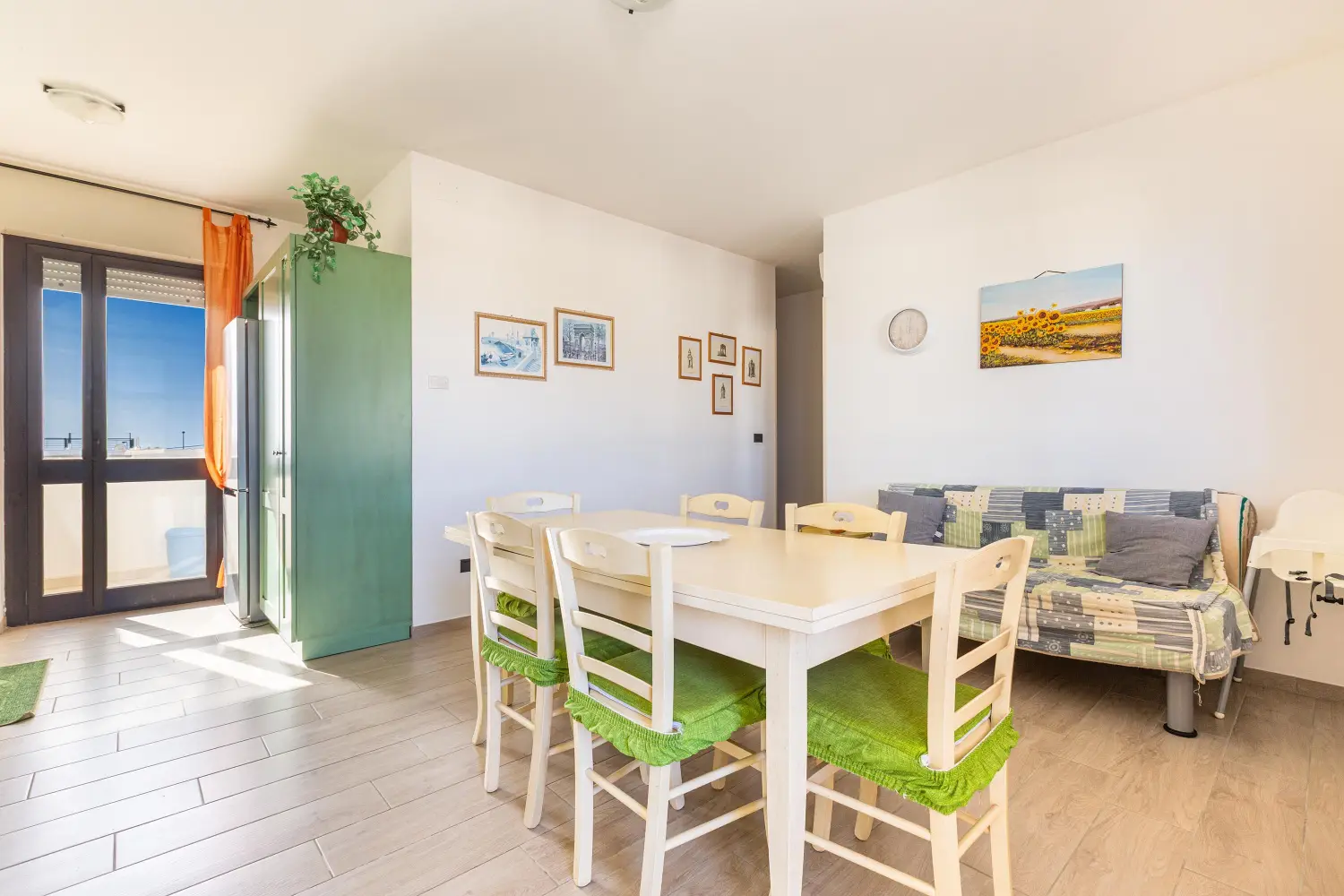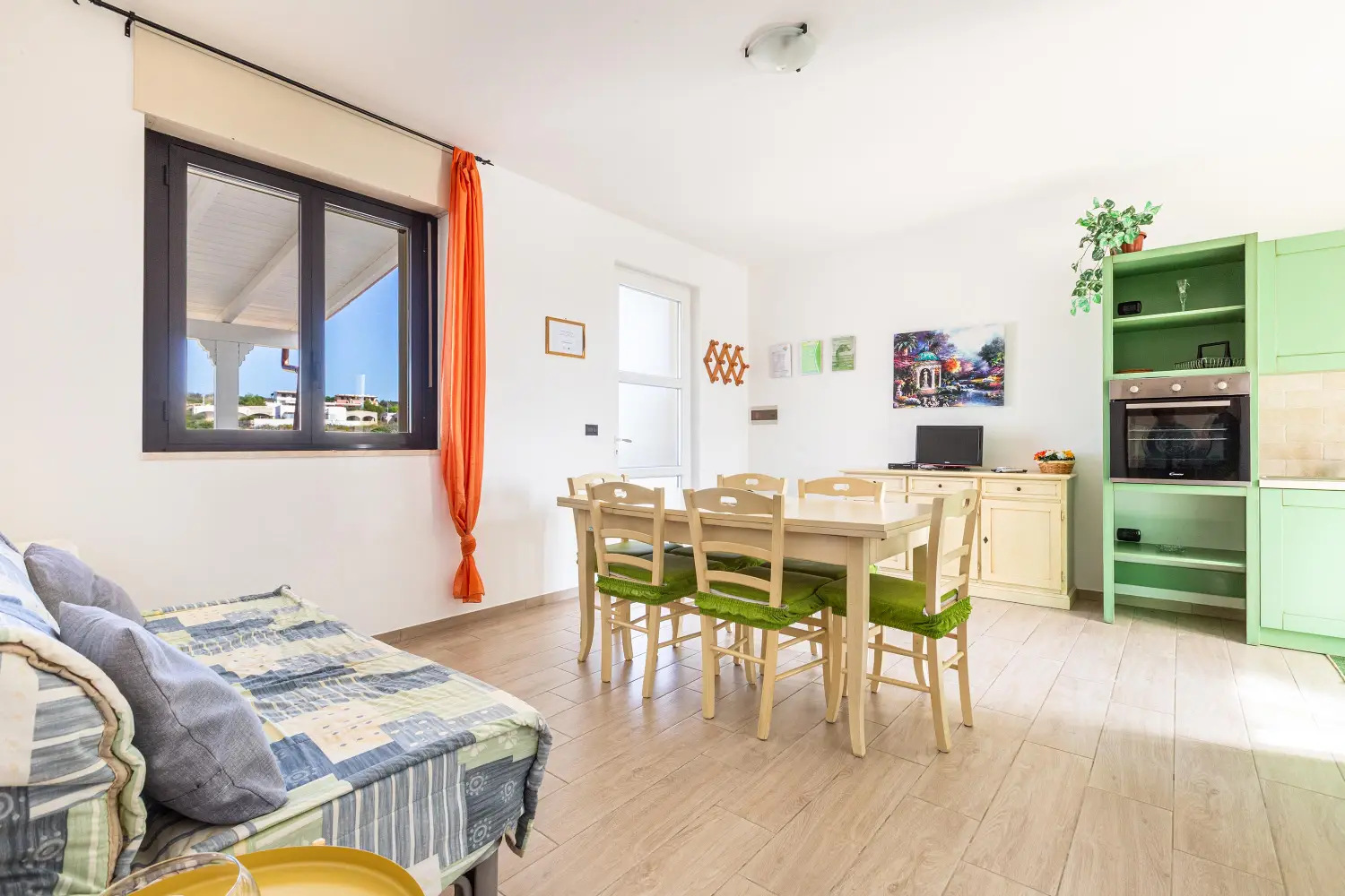 The living area welcomes guests with a fully equipped kitchen, featuring modern appliances and a comfortable dining table, ideal for sharing meals in a pleasant and functional environment.