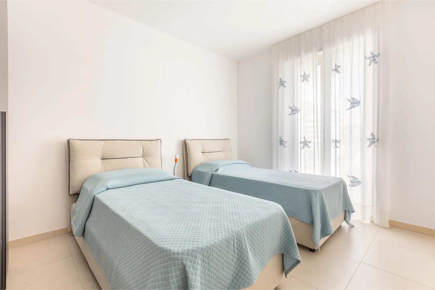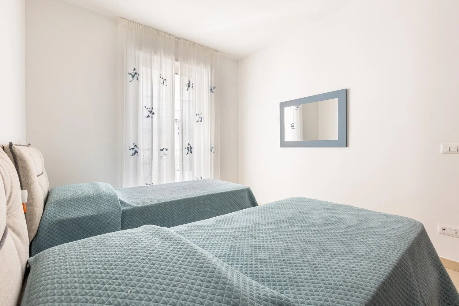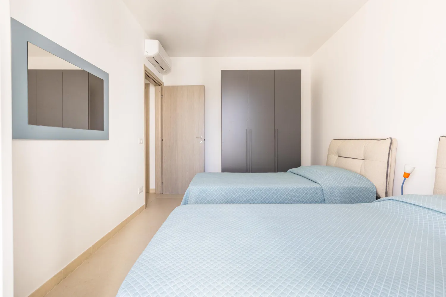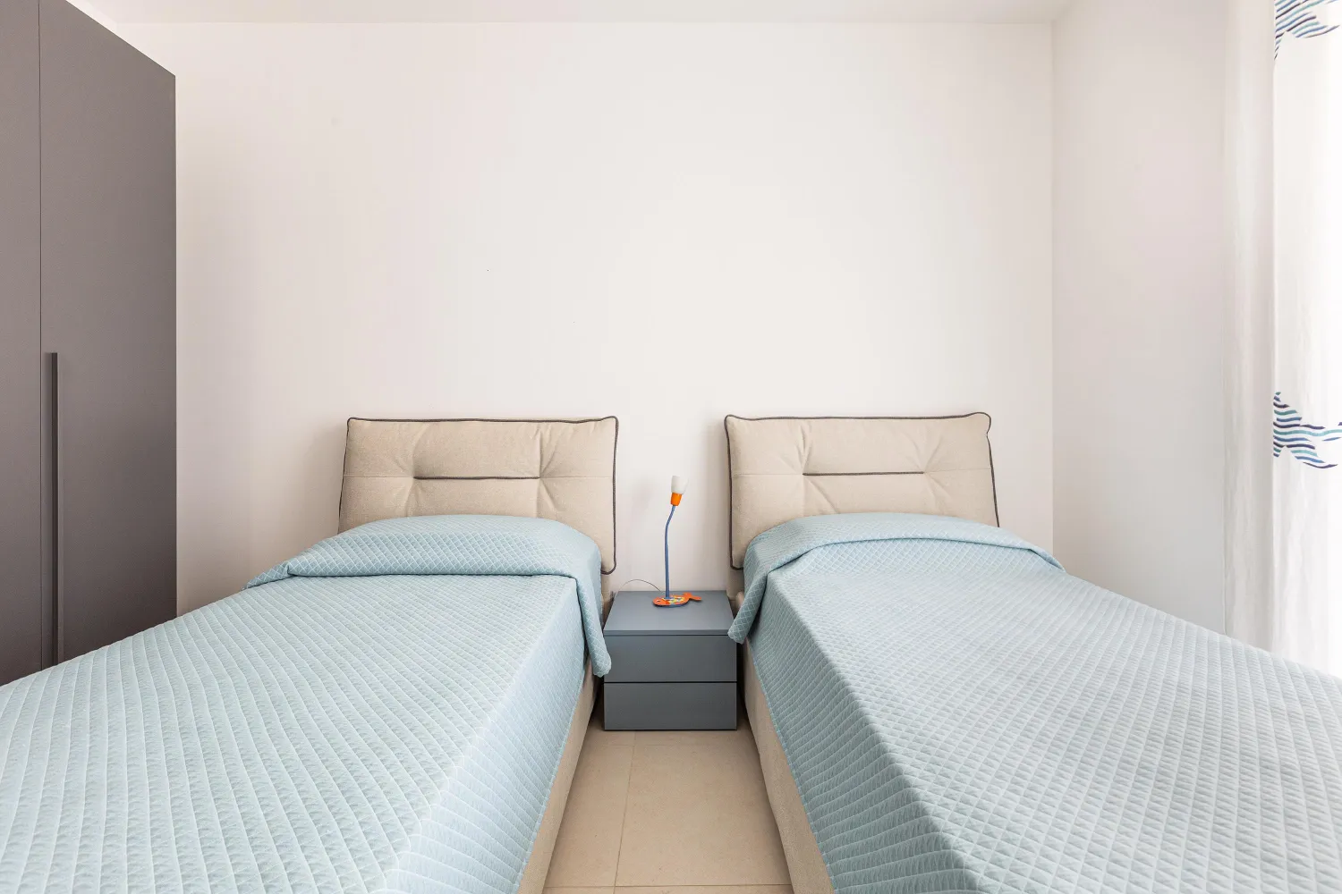 The sleeping area features two elegant bedrooms, one with a double bed and one with two single beds, finished to the finest details and featuring contemporary design, conceived as true spaces of well-being.