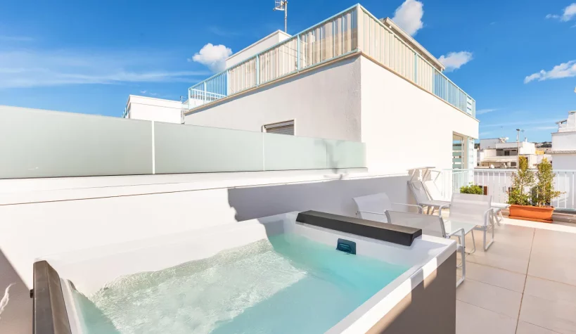 A distinctive feature of the property is the exclusive panoramic rooftop located on the second floor: a spacious terrace equipped with a private heated jacuzzi, sunbathing area, pergola and outdoor kitchen, and a full bathroom, designed to enjoy open-air luxury in complete privacy. By day it offers brightness and absolute relaxation; as evening falls, it transforms into an evocative and highly charming setting.