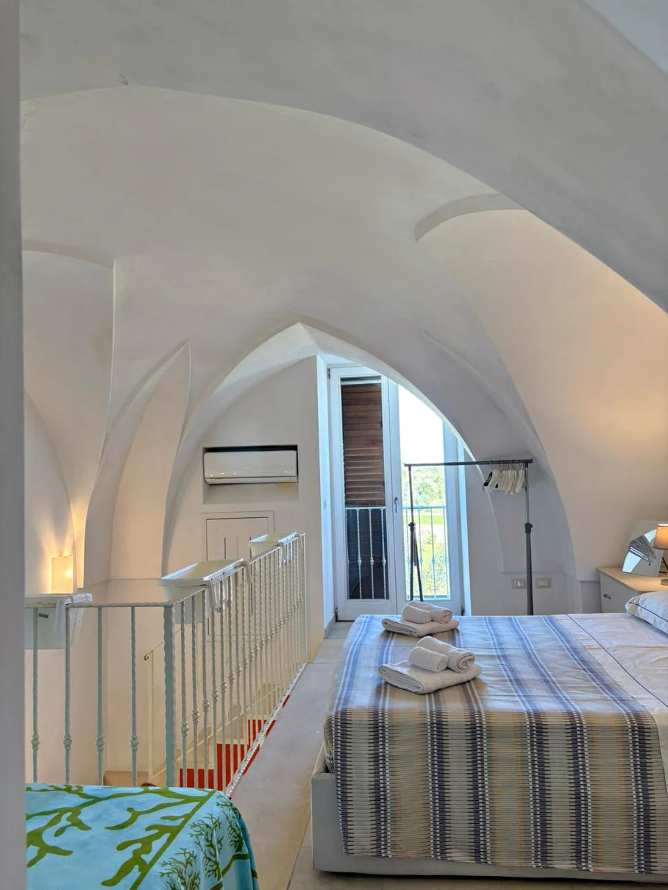 Al piano superiore, la camera matrimoniale con suggestive volte a stella , simbolo dell’autenticità salentina, crea un’atmosfera intima e sofisticata, completata da un secondo bagno.